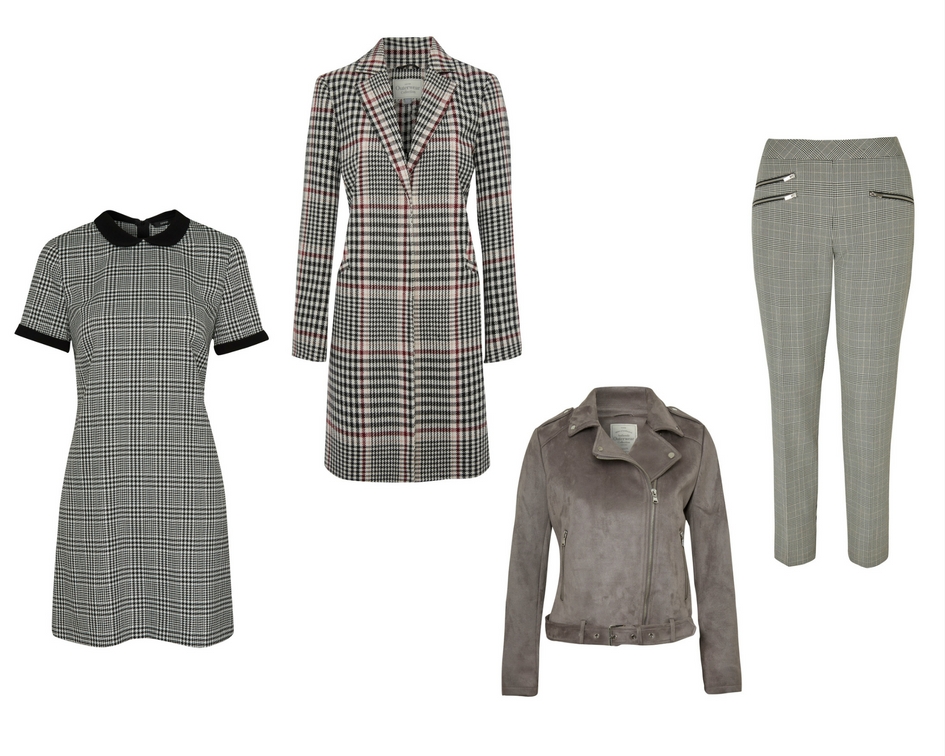 | (From left to right:) Dogtooth Dress £16, Check Coat £25, Grey Suede Jacket £28, Check Trouser £14 all from George. |